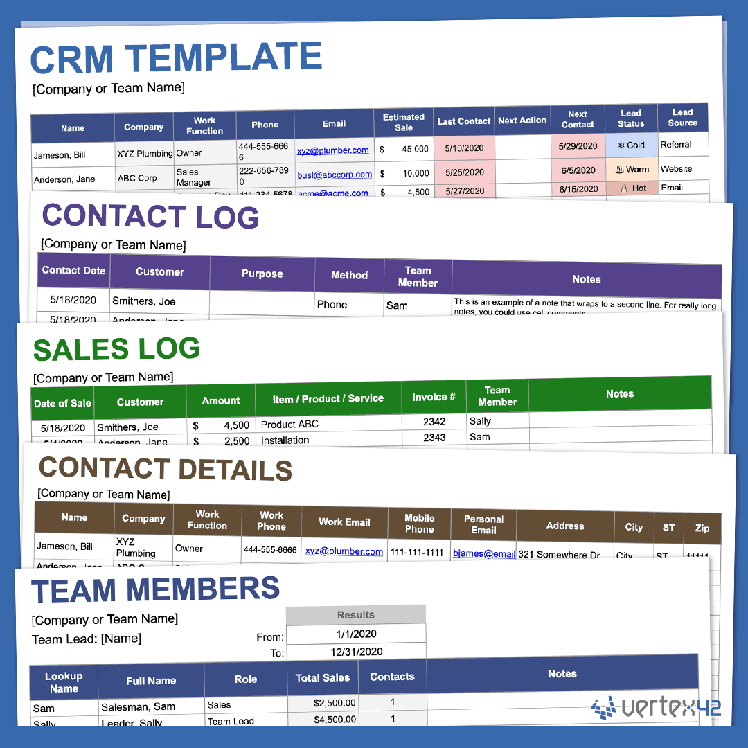 The Google Sheets version is now a collaborative crm database and includes a new Team Members table. You can pick a team member in the Contact Log and Sales Log tables and see a summary of the total sales and total contacts in the Team Members table.