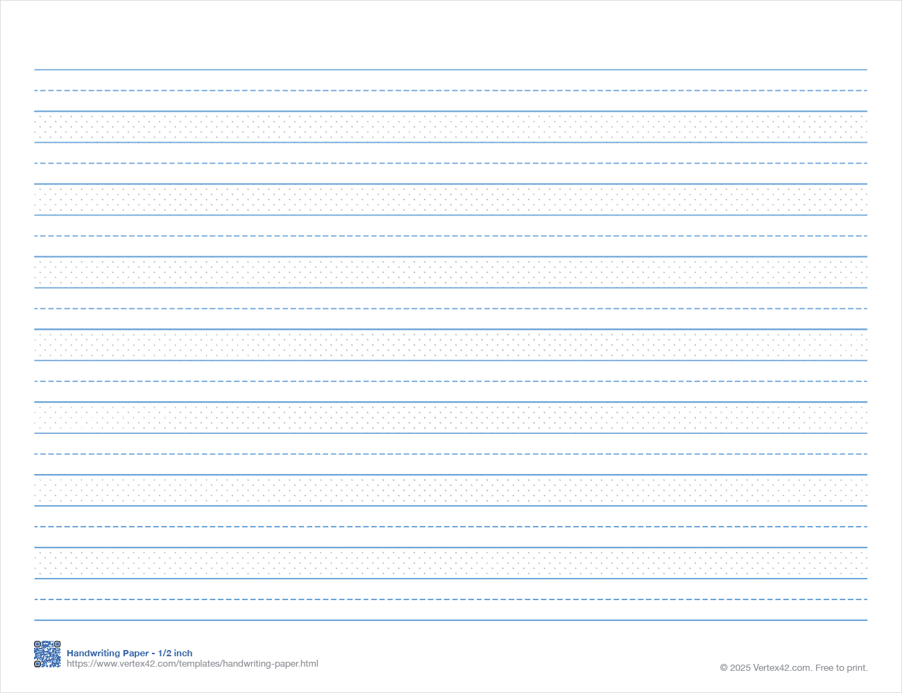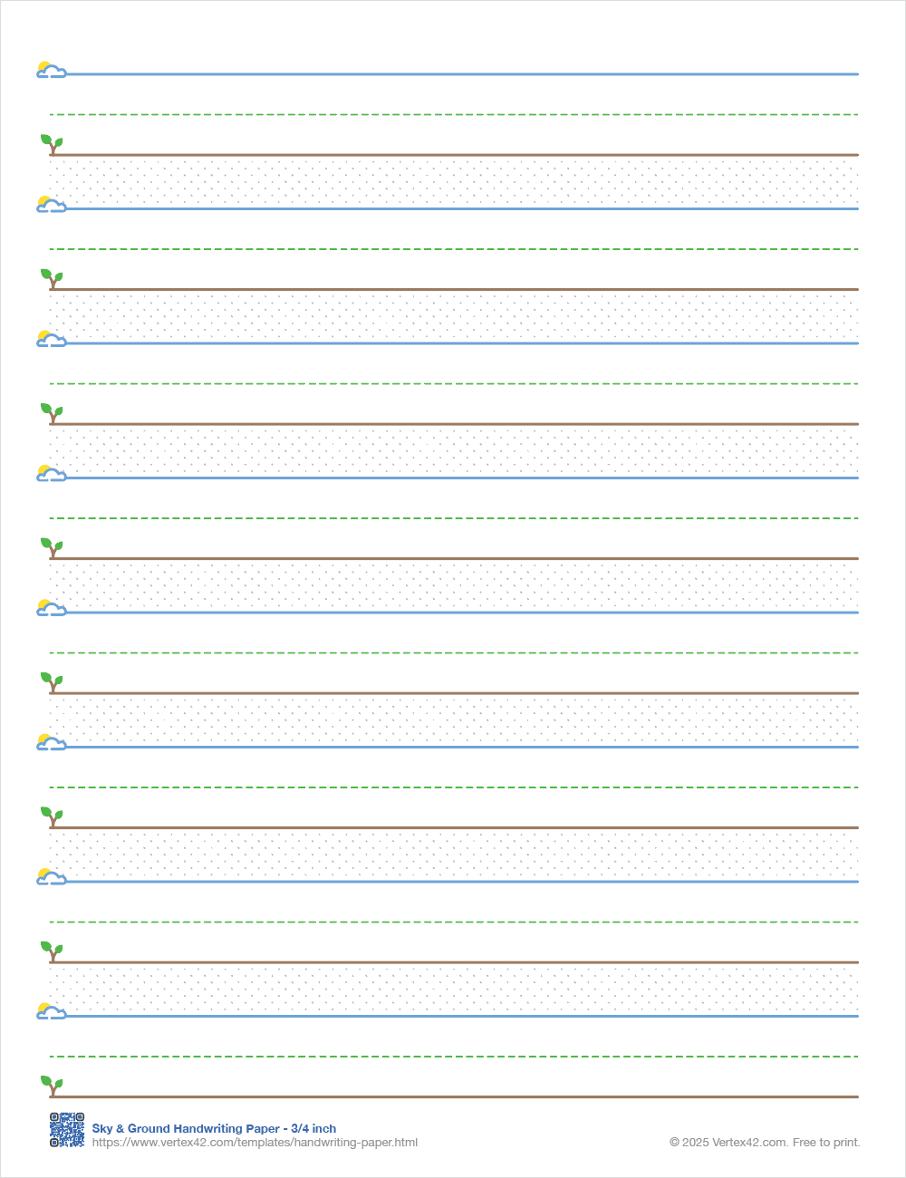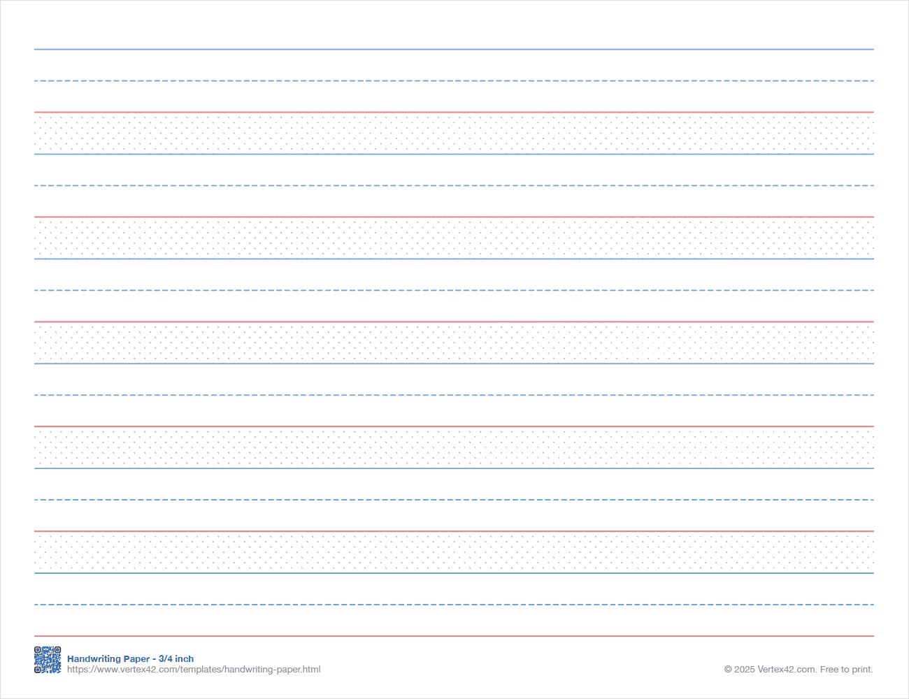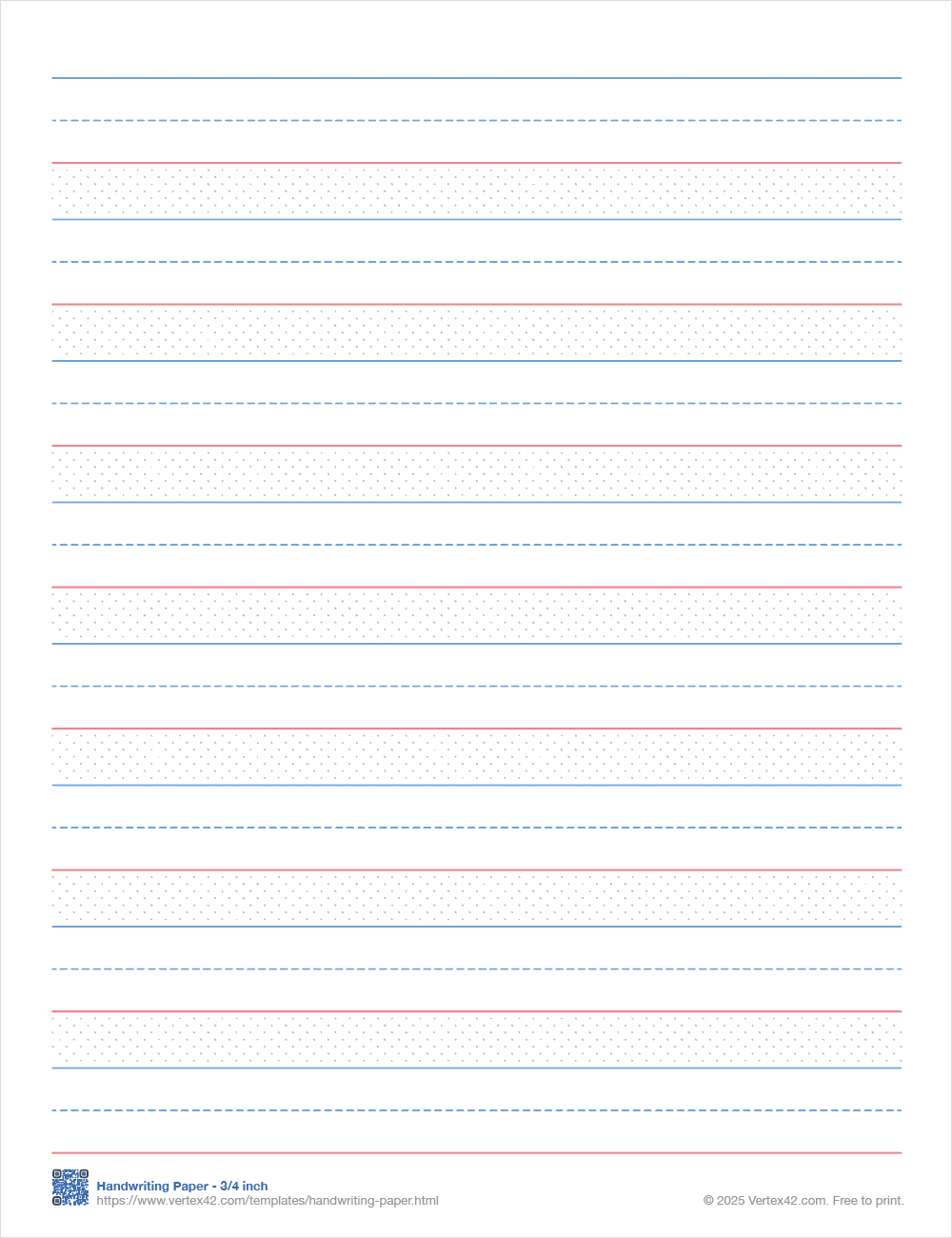 The ¾-inch and ½-inch sheets feature a subtle dotted pattern between writing rows, a simple visual cue that helps children see where not to write and improves line awareness during handwriting practice.